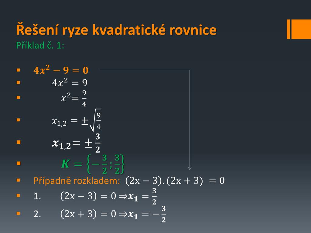 Řešení ryze kvadratické rovnice • Příklad č. 1: • Případně rozkladem: • 1. • 2.