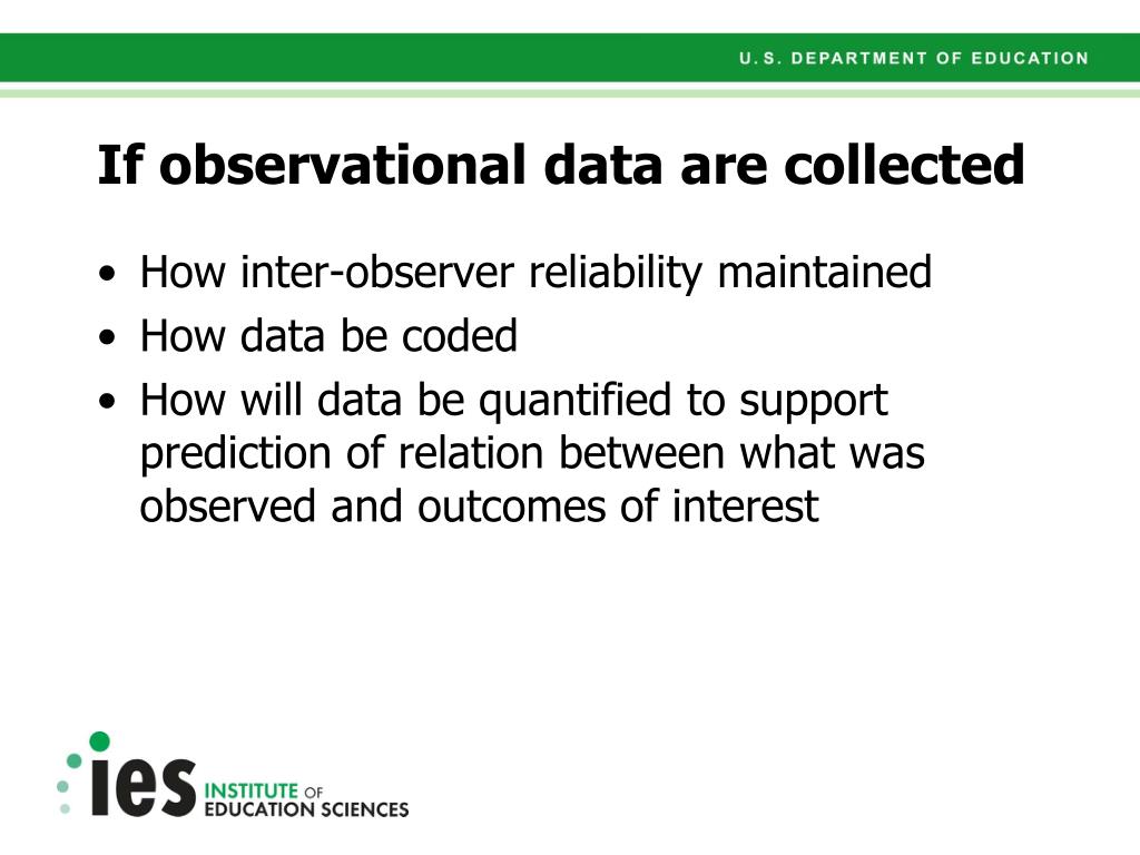 If observational data are collected • How inter-observer reliability maintained • How data be coded • How will data be quantified to support prediction of relation between what was observed and outcomes of interest