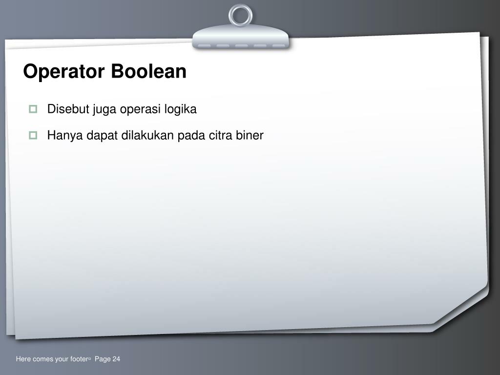 Operator Boolean • Disebut juga operasi logika • Hanya dapat dilakukan pada citra biner Here comes your footer Page 24