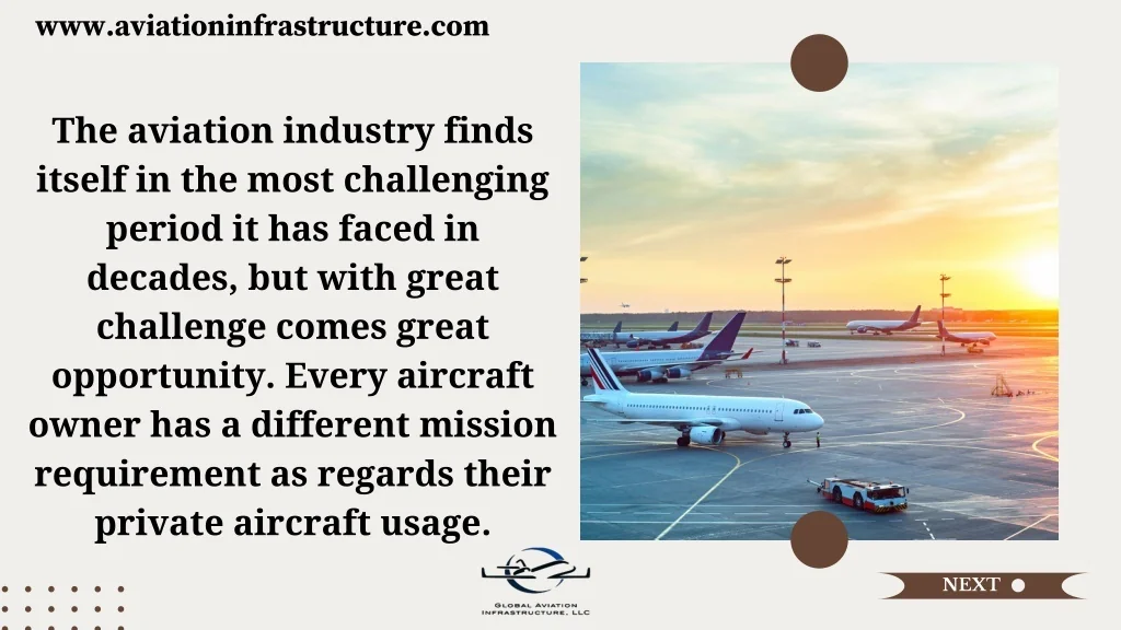 www.aviationinfrastructure.com The aviation industry finds itself in the most challenging period it has faced in decades, but with great challenge comes great opportunity. Every aircraft owner has a different mission requirement as regards their private aircraft usage. NEXT