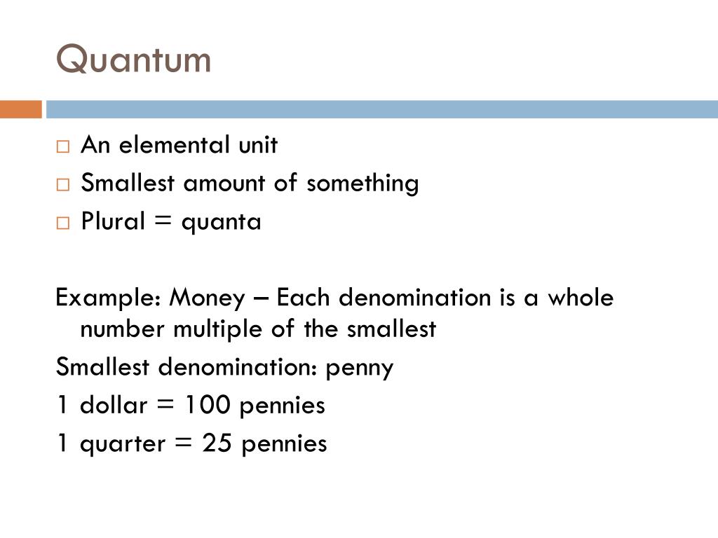 Quantum • An elemental unit • Smallest amount of something • Plural = quanta Example: Money – Each denomination is a whole number multiple of the smallest Smallest denomination: penny 1 dollar = 100 pennies 1 quarter = 25 pennies