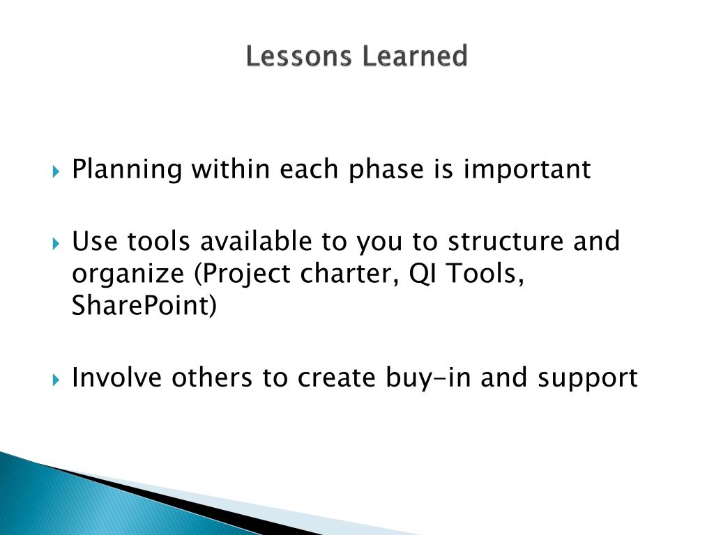 Lessons Learned • Planning within each phase is important • Use tools available to you to structure and organize (Project charter, QI Tools, SharePoint) • Involve others to create buy-in and support