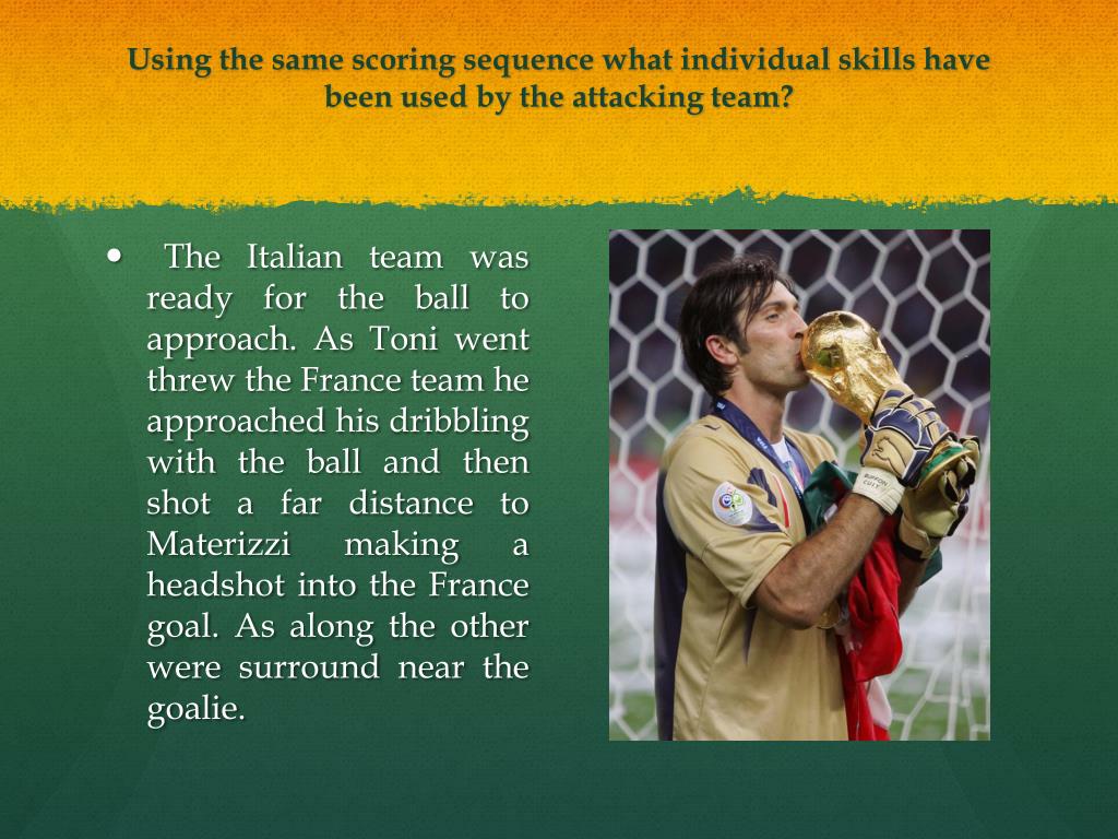 Using the same scoring sequence what individual skills have been used by the attacking team? • The Italian team was ready for the ball to approach. As Toni went threw the France team he approached his dribbling with the ball and then shot a far distance to Materizzi making a headshot into the France goal. As along the other were surround near the goalie.