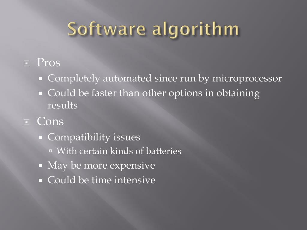 Software algorithm • Pros • Completely automated since run by microprocessor • Could be faster than other options in obtaining results • Cons • Compatibility issues • With certain kinds of batteries • May be more expensive • Could be time intensive