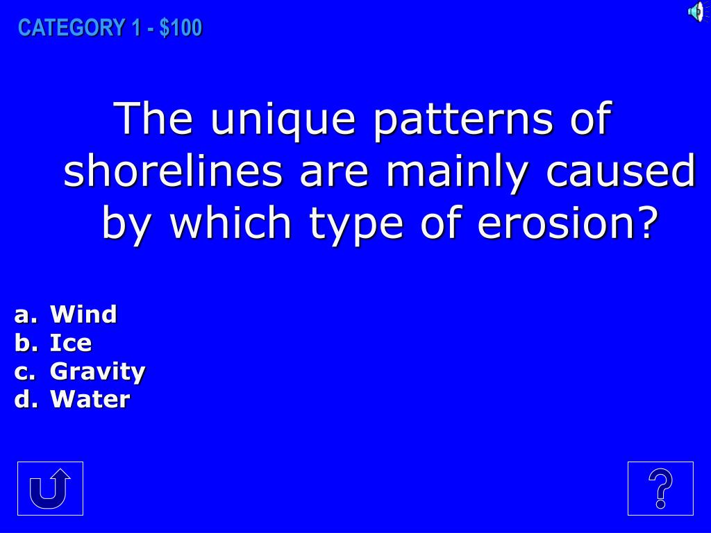 CATEGORY 1 - $100 • The unique patterns of shorelines are mainly caused by which type of erosion? • Wind • Ice • Gravity • Water