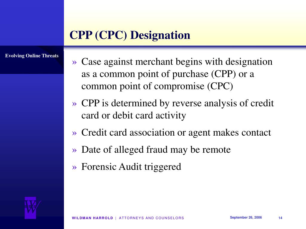 CPP (CPC) Designation • Case against merchant begins with designation as a common point of purchase (CPP) or a common point of compromise (CPC) • CPP is determined by reverse analysis of credit card or debit card activity • Credit card association or agent makes contact • Date of alleged fraud may be remote • Forensic Audit triggered