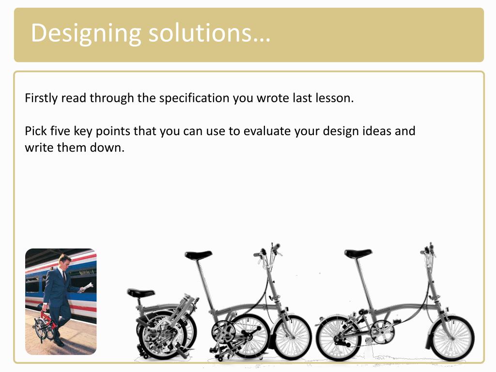 Designing solutions… Firstly read through the specification you wrote last lesson. Pick five key points that you can use to evaluate your design ideas and write them down.