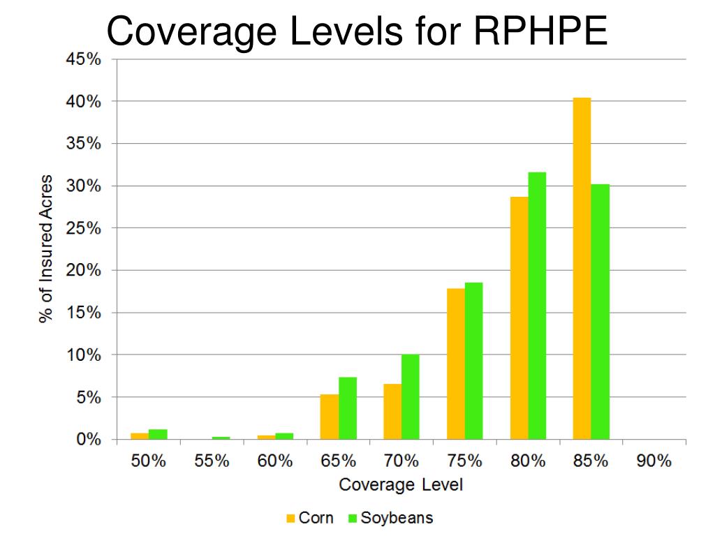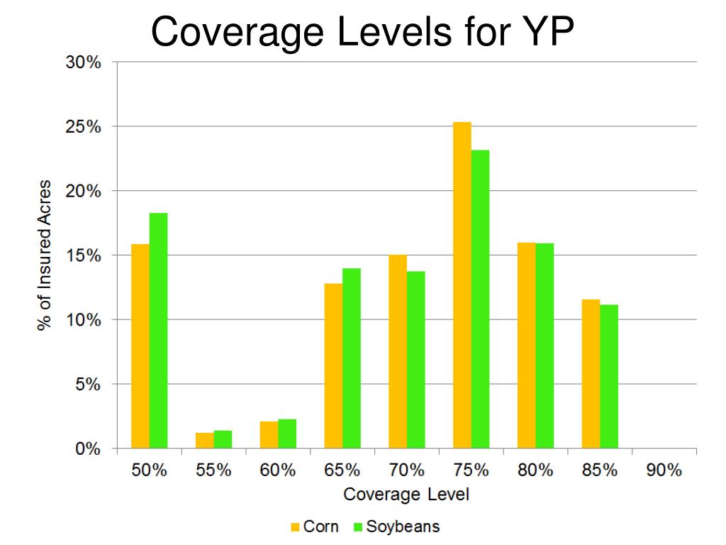 2014 Insurance Premiums Per Acre Premiums ($ per acre) Cov. Level YP RPHPE RP_ 50% 0.74 0.62 0.83 55% 1.09 0.93 1.33 60% 1.54 1.29 2.02 65% 2.37 2.01 3.30 70% 2.91 2.62 4.60 75% 4.14 4.19 7.50 80% 6.23 7.04 12.67 85% 9.50 11.61 20.97 For our example farm in Story County, Iowa for corn
