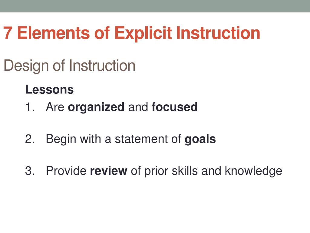 7 Elements of Explicit InstructionDesign of Instruction Lessons 1. Are organized and focused 2. Begin with a statement of goals 3. Provide review of prior skills and knowledge