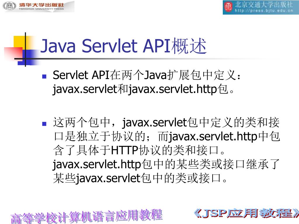 Java Servlet API概述 • Servlet API在两个Java扩展包中定义:javax.servlet和javax.servlet.http包。 • 这两个包中,javax.servlet包中定义的类和接口是独立于协议的;而javax.servlet.http中包含了具体于HTTP协议的类和接口。javax.servlet.http包中的某些类或接口继承了某些javax.servlet包中的类或接口。
