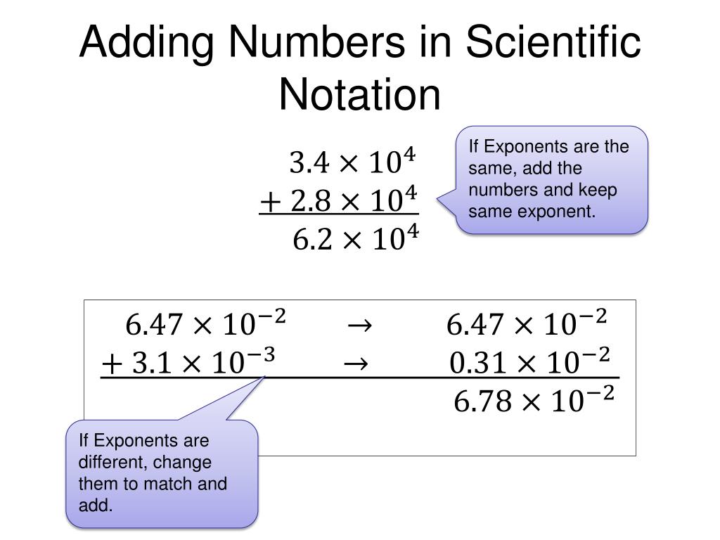 Adding Numbers in Scientific Notation If Exponents are the same, add the numbers and keep same exponent. If Exponents are different, change them to match and add.