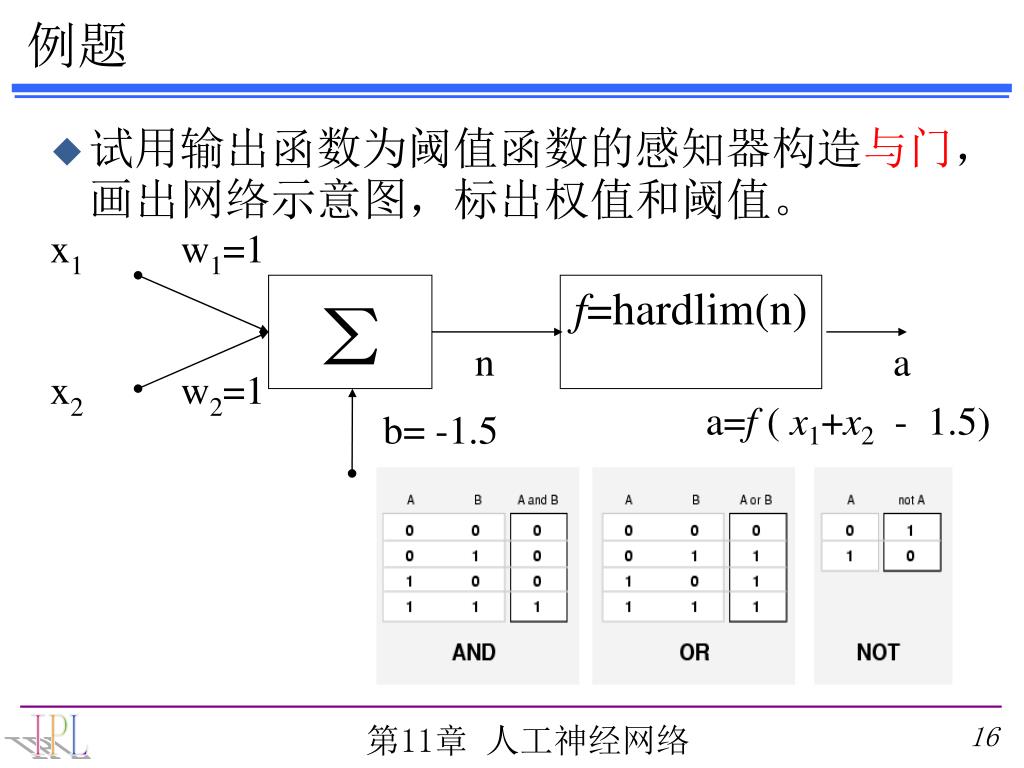 x1 w1=1 Σ f=hardlim(n) n a x2 w2=1 b= -1.5 例题 • 试用输出函数为阈值函数的感知器构造与门,画出网络示意图,标出权值和阈值。 a=f ( x1+x2 - 1.5)