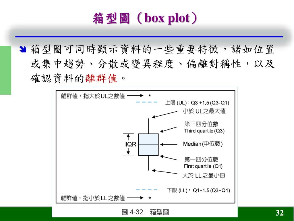 箱型圖(box plot) • 箱型圖可同時顯示資料的一些重要特徵,諸如位置或集中趨勢、分散或變異程度、偏離對稱性,以及確認資料的離群值。