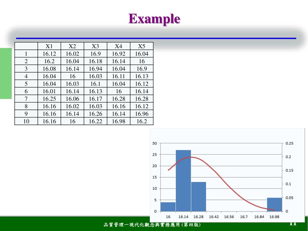 直方圖繪製步驟 • 決定區間之上下界限 • 第一區間之下側界限值=S-(測定單位 )/2 • 第一區間之上側界限值=第一區間之下側值+h 設e=(S+hk)-L 若 e>(h/2),則將第一區間之下側界限直設為 (S-(測定單位)/2-e/2) • 求出區間之中心值 • 製作次數表 • 計算數據之次數 • 作圖