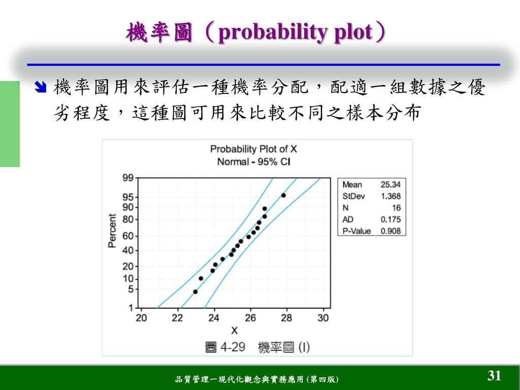 機率圖(probability plot) • 機率圖用來評估一種機率分配,配適一組數據之優劣程度,這種圖可用來比較不同之樣本分布