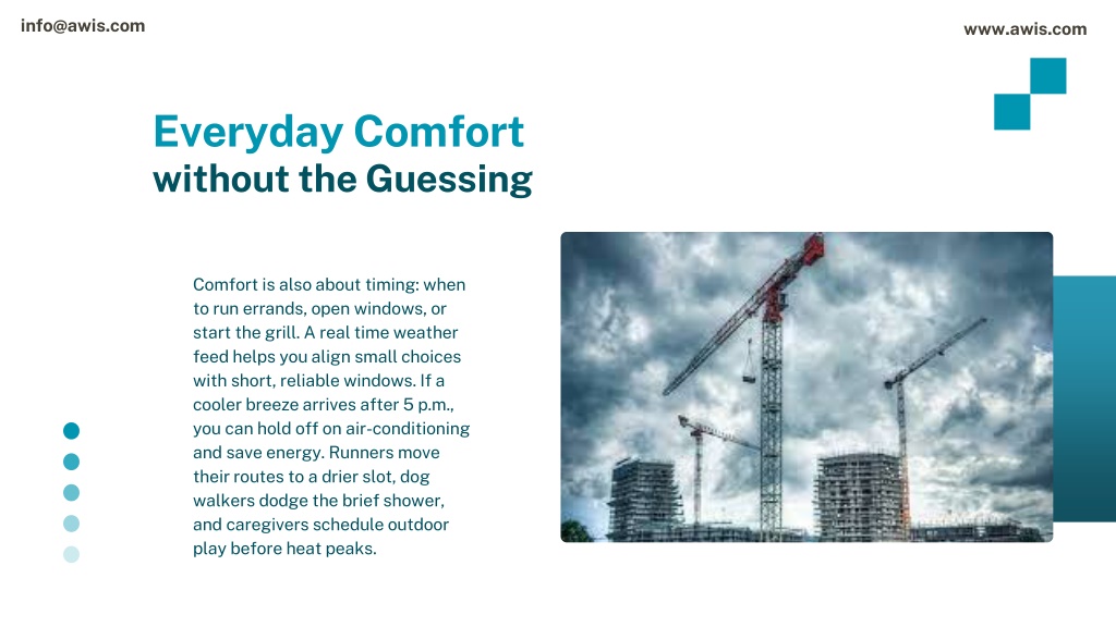 4. info@awis.com www.awis.com Everyday Comfort without the Guessing Comfort is also about timing: when to run errands, open windows, or start the grill. A real time weather feed helps you align small choices with short, reliable windows. If a cooler breeze arrives after 5 p.m., you can hold off on air-conditioning and save energy. Runners move their routes to a drier slot, dog walkers dodge the brief shower, and caregivers schedule outdoor play before heat peaks.