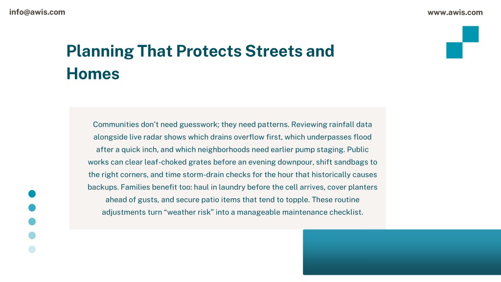 3. info@awis.com www.awis.com Planning That Protects Streets and Homes Communities don’t need guesswork; they need patterns. Reviewing rainfall data alongside live radar shows which drains overflow first, which underpasses flood after a quick inch, and which neighborhoods need earlier pump staging. Public works can clear leaf-choked grates before an evening downpour, shift sandbags to the right corners, and time storm-drain checks for the hour that historically causes backups. Families benefit too: haul in laundry before the cell arrives, cover planters ahead of gusts, and secure patio items that tend to topple. These routine adjustments turn “weather risk” into a manageable maintenance checklist.