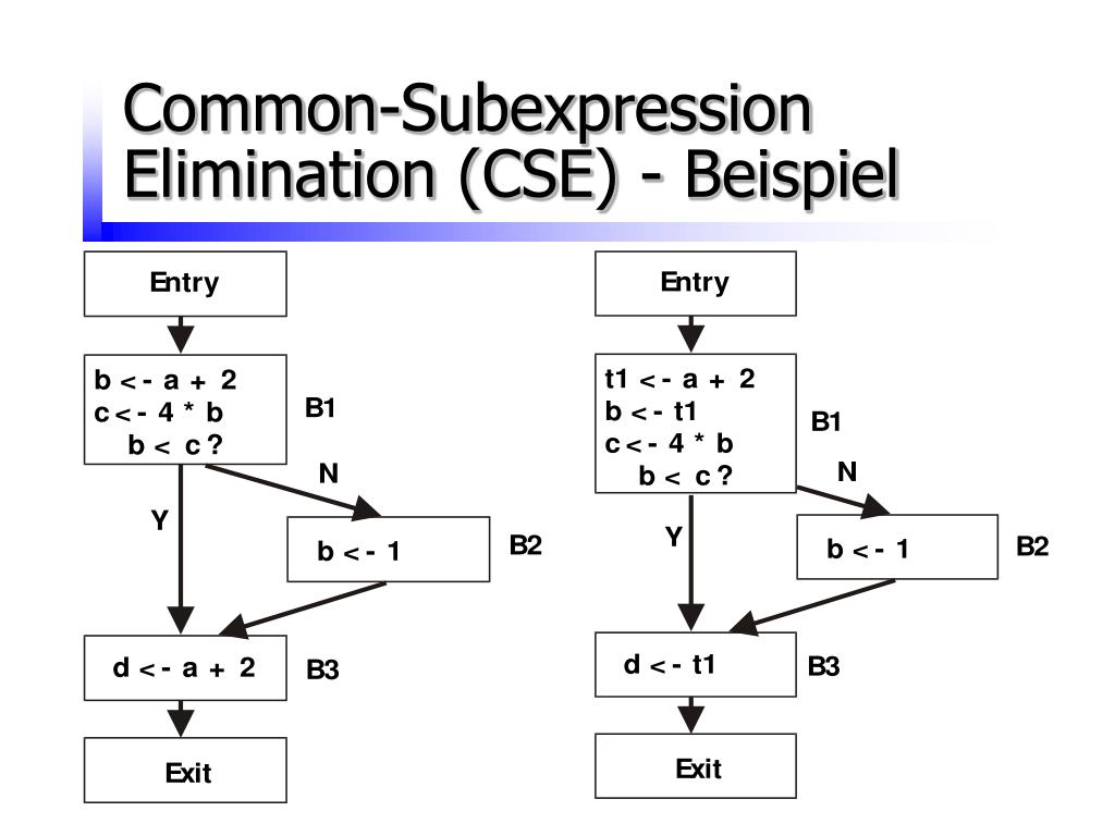 Common-Subexpression Elimination (CSE) -> Identische Ausdrücke (Berechnungen) können gespeichert werden, damit der entsprechende Wert nicht neu berechnet werden muß. -> Datenflußanalyse notwendig