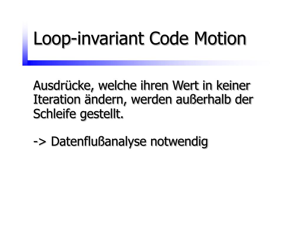 Loop-invariant Code Motion Ausdrücke, welche ihren Wert in keiner Iteration ändern, werden außerhalb der Schleife gestellt. -> Datenflußanalyse notwendig