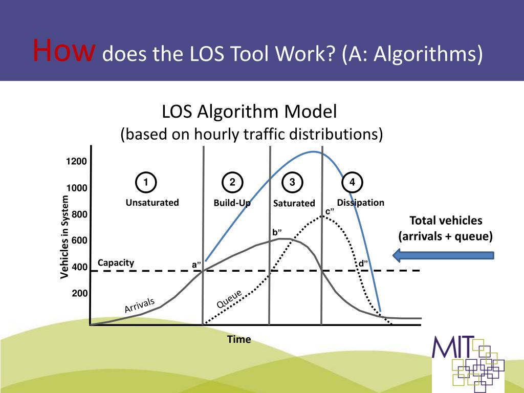 How does the LOS Tool Work? (A: Algorithms) LOS Algorithm Model (based on hourly traffic distributions) Total vehicles (arrivals + queue)