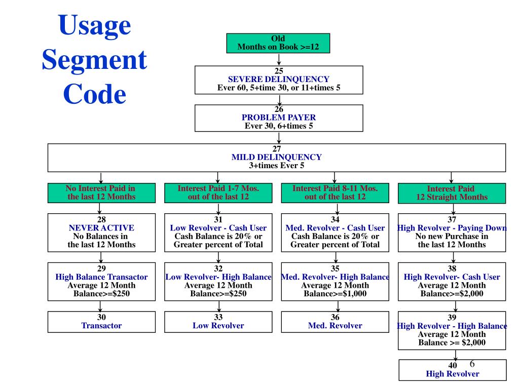 Old Months on Book >=12 Usage Segment Code 25 SEVEREDELINQUENCY Ever 60, 5+time 30, or 11+times 5 26 PROBLEM PAYER Ever 30, 6+times 5 27 MILD DELINQUENCY 3+times Ever 5 No Interest Paid in the last 12 Months Interest Paid 1-7 Mos. out of the last 12 Interest Paid 8-11 Mos. out of the last 12 Interest Paid 12 Straight Months 28 NEVER ACTIVE No Balances in the last 12 Months 31 Low Revolver - Cash User Cash Balance is 20% or Greater percent of Total 34 Med. Revolver - Cash User Cash Balance is 20% or Greater percent of Total 37 High Revolver - Paying Down No new Purchase in the last 12 Months 29 High Balance Transactor Average 12 Month Balance>=$250 32 Low Revolver- High Balance Average 12 Month Balance>=$250 35 Med. Revolver- High Balance Average 12 Month Balance>=$1,000 38 High Revolver- Cash User Average 12 Month Balance>=$2,000 30 Transactor 33 Low Revolver 36 Med. Revolver 39 High Revolver - High Balance Average 12 Month Balance >= $2,000 40 High Revolver