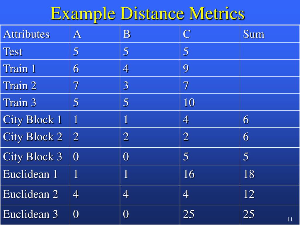 Measuring Distance / Similarity • Distance / Similarity are opposites – it doesn’t matter which you measure • Distances for each attribute calculated, must be combined • Combination of distances – commonly via “city block” or “euclidean” (“crow flies”) • <go back one slide to illustrate> • Higher power(s) increase the influence of large differences