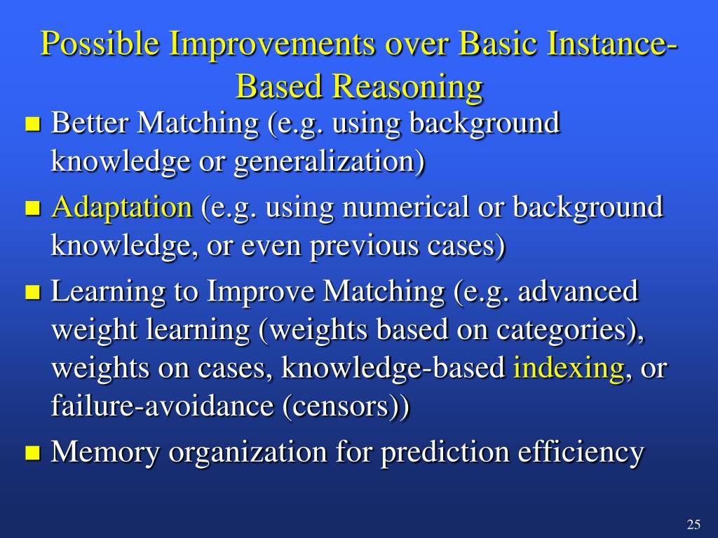Possible Improvements over Basic Instance-Based Reasoning • Better Matching (e.g. using background knowledge or generalization) • Adaptation (e.g. using numerical or background knowledge, or even previous cases) • Learning to Improve Matching (e.g. advanced weight learning (weights based on categories), weights on cases, knowledge-based indexing, or failure-avoidance (censors)) • Memory organization for prediction efficiency