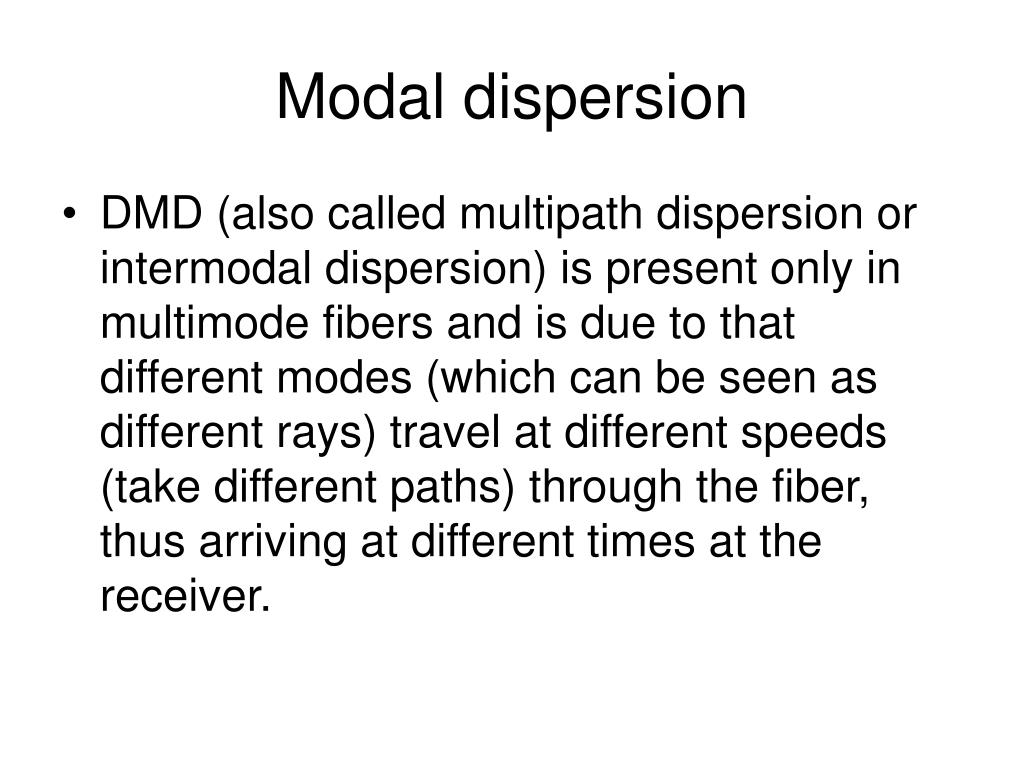 Modal dispersion • DMD (also called multipath dispersion or intermodal dispersion) is present only in multimode fibers and is due to that different modes (which can be seen as different rays) travel at different speeds (take different paths) through the fiber, thus arriving at different times at the receiver.