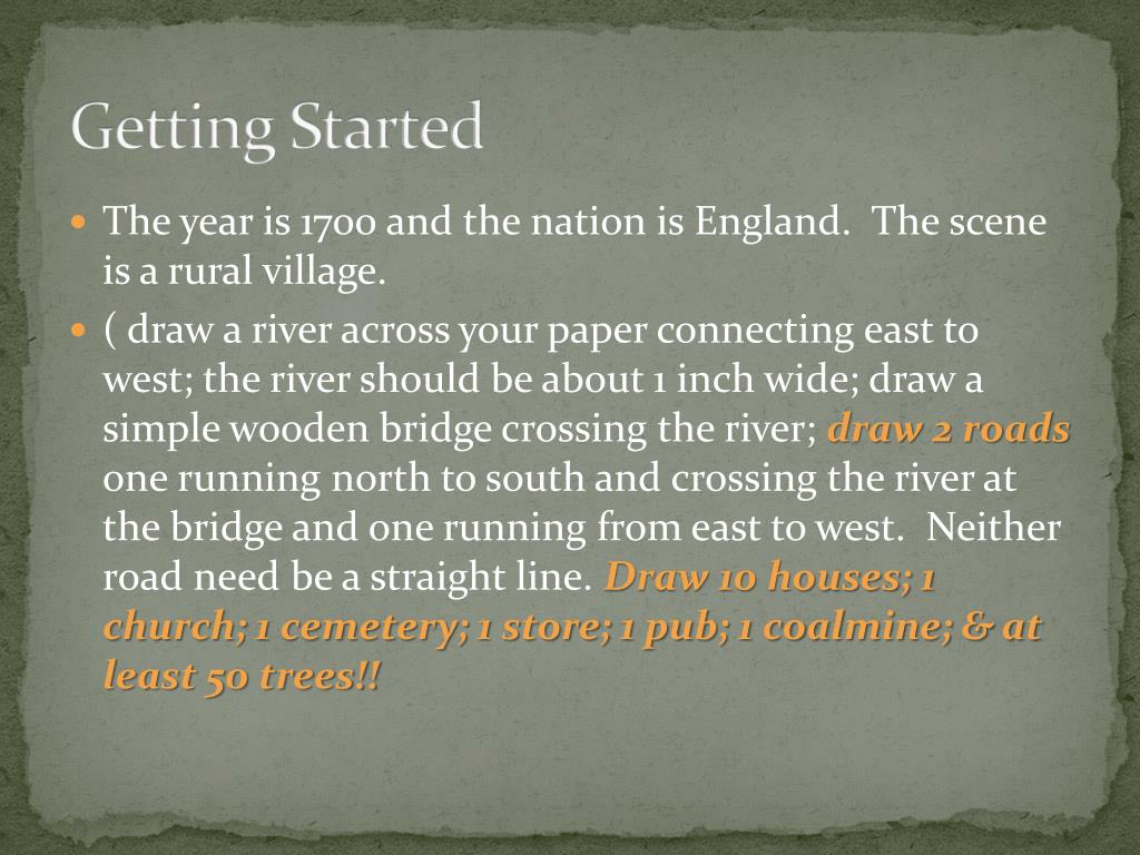 Getting Started • The year is 1700 and the nation is England. The scene is a rural village. • ( draw a river across your paper connecting east to west; the river should be about 1 inch wide; draw a simple wooden bridge crossing the river; draw 2 roads one running north to south and crossing the river at the bridge and one running from east to west. Neither road need be a straight line. Draw 10 houses; 1 church; 1 cemetery; 1 store; 1 pub; 1 coalmine; & at least 50 trees!!