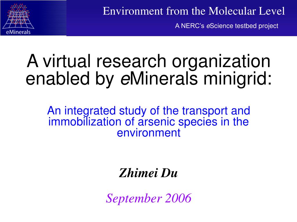 Environment from the Molecular Level A NERC’s eScience testbed project A virtual research organization enabled by eMinerals minigrid:An integrated study of the transport andimmobilization of arsenic species in the environmentZhimei DuSeptember 2006