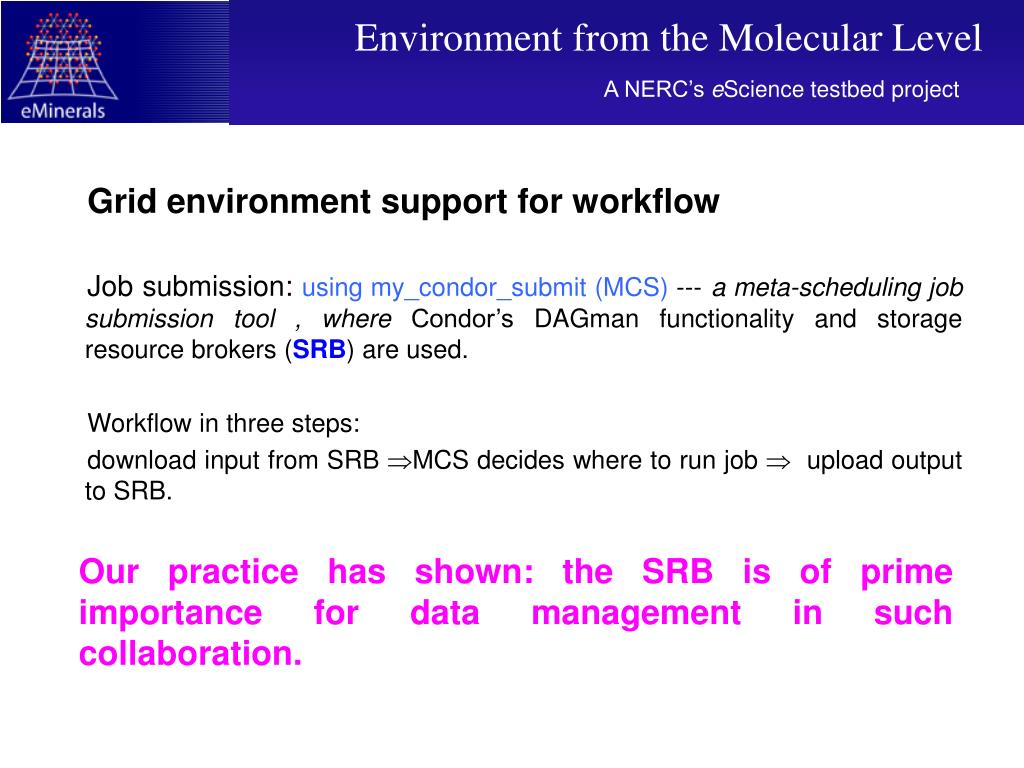 Environment from the Molecular Level A NERC’s eScience testbed project Grid environment support for workflow Job submission: using my_condor_submit (MCS) ---a meta-scheduling job submission tool , where Condor’s DAGman functionality and storage resource brokers (SRB) are used. Workflow in three steps: download input from SRB MCS decides where to run job upload output to SRB. Our practice has shown: the SRB is of prime importance for data management in such collaboration.
