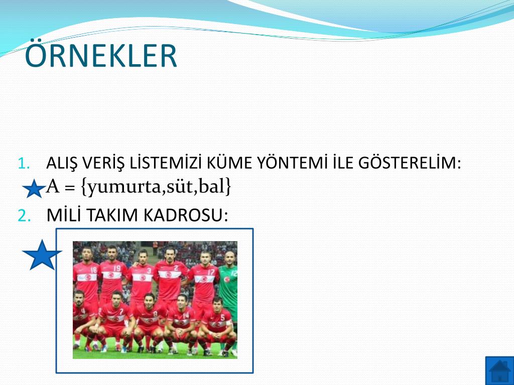 ÖRNEKLER • ALIŞ VERİŞ LİSTEMİZİ KÜME YÖNTEMİ İLE GÖSTERELİM: A = {yumurta,süt,bal} • MİLİ TAKIM KADROSU: