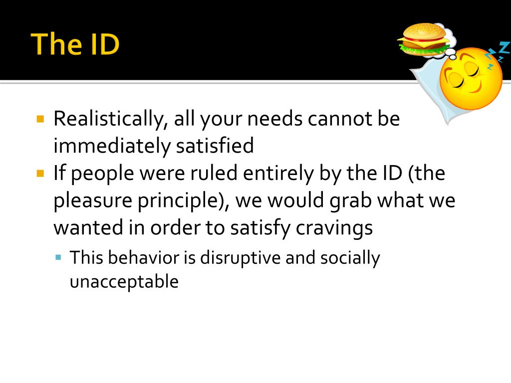The ID • Realistically, all your needs cannot be immediately satisfied • If people were ruled entirely by the ID (the pleasure principle), we would grab what we wanted in order to satisfy cravings • This behavior is disruptive and socially unacceptable