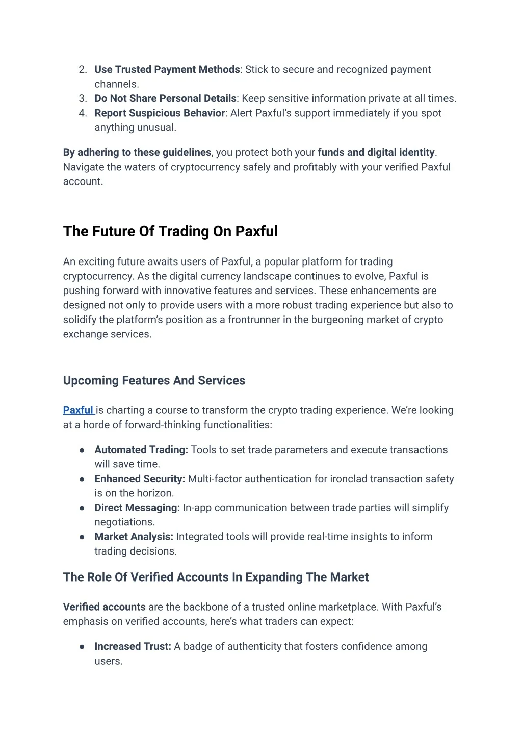 2. Use Trusted Payment Methods: Stick to secure and recognized payment channels. 3. Do Not Share Personal Details: Keep sensitive information private at all times. 4. Report Suspicious Behavior: Alert Paxful’s support immediately if you spot anything unusual. By adhering to these guidelines, you protect both your funds and digital identity. Navigate the waters of cryptocurrency safely and profitably with your verified Paxful account. The Future Of Trading On Paxful An exciting future awaits users of Paxful, a popular platform for trading cryptocurrency. As the digital currency landscape continues to evolve, Paxful is pushing forward with innovative features and services. These enhancements are designed not only to provide users with a more robust trading experience but also to solidify the platform’s position as a frontrunner in the burgeoning market of crypto exchange services. Upcoming Features And Services Paxful is charting a course to transform the crypto trading experience. We’re looking at a horde of forward-thinking functionalities: ● Automated Trading: Tools to set trade parameters and execute transactions will save time. ● Enhanced Security: Multi-factor authentication for ironclad transaction safety is on the horizon. ● Direct Messaging: In-app communication between trade parties will simplify negotiations. ● Market Analysis: Integrated tools will provide real-time insights to inform trading decisions. The Role Of Verified Accounts In Expanding The Market Verified accounts are the backbone of a trusted online marketplace. With Paxful’s emphasis on verified accounts, here’s what traders can expect: ● Increased Trust: A badge of authenticity that fosters confidence among users.