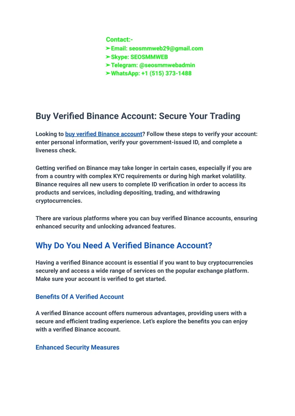 Contact:- ➤Email: seosmmweb29@gmail.com ➤Skype: SEOSMMWEB ➤Telegram: @seosmmwebadmin ➤WhatsApp: +1 (515) 373-1488 Buy Verified Binance Account: Secure Your Trading Looking to buy verified Binance account? Follow these steps to verify your account: enter personal information, verify your government-issued ID, and complete a liveness check. Getting verified on Binance may take longer in certain cases, especially if you are from a country with complex KYC requirements or during high market volatility. Binance requires all new users to complete ID verification in order to access its products and services, including depositing, trading, and withdrawing cryptocurrencies. There are various platforms where you can buy verified Binance accounts, ensuring enhanced security and unlocking advanced features. Why Do You Need A Verified Binance Account? Having a verified Binance account is essential if you want to buy cryptocurrencies securely and access a wide range of services on the popular exchange platform. Make sure your account is verified to get started. Benefits Of A Verified Account A verified Binance account offers numerous advantages, providing users with a secure and efficient trading experience. Let’s explore the benefits you can enjoy with a verified Binance account. Enhanced Security Measures
