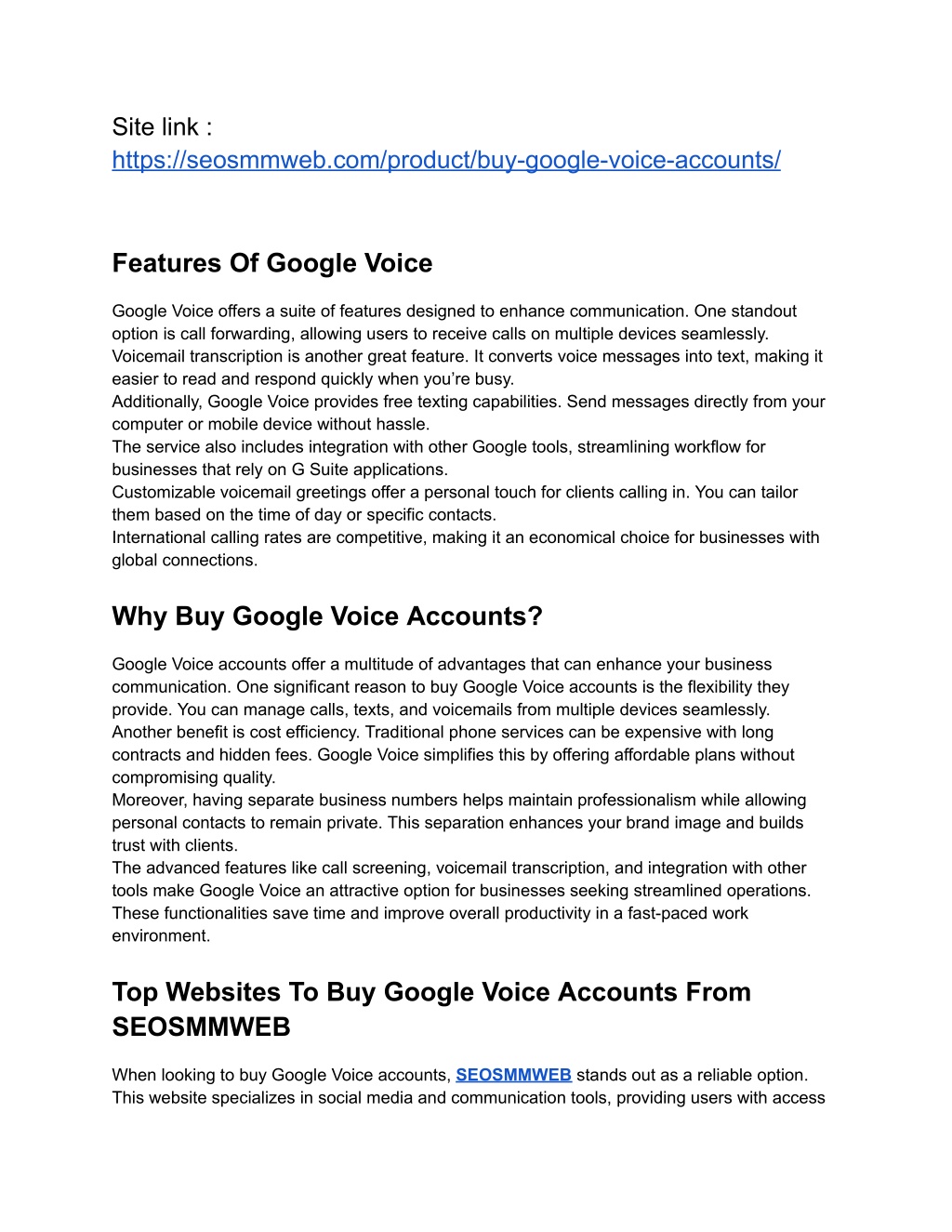 call forwarding, come at no extra charge compared to traditional phone systems. Additionally, integrating Google Voice with other tools enhances productivity. Seamless collaboration with apps like Google Workspace makes it easy to stay organized. Customer support also sees improvement when using Google Voice; it's easier to track communications through one central platform rather than juggling several different services. Where to Buy Google Voice Accounts Safely When you’re looking to buy Google Voice accounts, safety should be a top priority. The right platform can make all the difference in protecting your investment. Start by exploring reputable online marketplaces that have positive reviews and user feedback. Websites dedicated to digital services often provide buyer protection measures. Consider forums or communities focused on business tools where members share trusted sellers. This peer recommendation can lead you to reliable sources for acquiring accounts safely.Additionally, look out for platforms that offer a money-back guarantee or detailed customer support options. These features indicate that the seller values customer satisfaction and is confident in their service quality. Research thoroughly before making any purchase. Checking multiple sources ensures you're not only getting a good deal but also securing an account from a trustworthy provider. If you want to Buy Google Voice Accounts ➤Email: seosmmweb29@gmail.com ➤Skype: SEOSMMWEB ➤Telegram: @seosmmwebadmin ➤WhatsApp: +1 (843) 877-7012 Site link :https://seosmmweb.com/product/buy-google-voice-accounts/ Top Websites to Buy Google Voice Accounts When looking to buy Google Voice accounts, several reputable websites stand out. Each provides unique benefits and services tailored for business needs. One popular option is SEOSMMWEB. This platform specializes in digital communication tools and offers a range of verified Google Voice accounts at competitive prices. Their user-friendly interface makes it easy to navigate through available options.