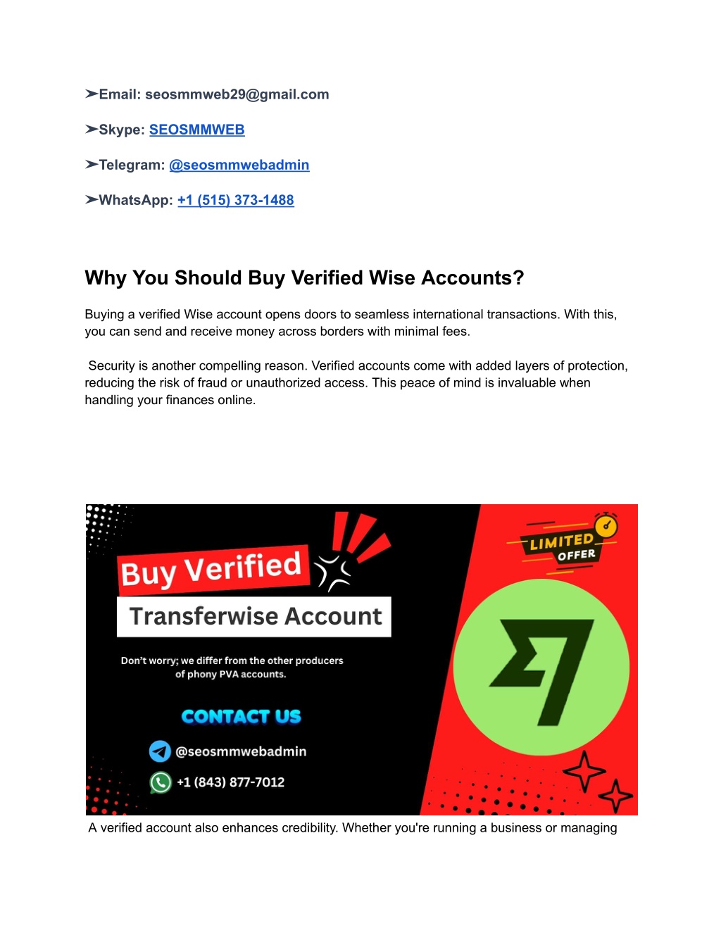 frequently list reputable sellers of verified accounts, making your search simpler. Always look for reviews and testimonials about the provider you’re considering. Genuine feedback can guide you toward trustworthy options while helping avoid potential scams. Why Should You Consider Buy Verified Transferwise Account? Buying a verified TransferWise account can open doors to numerous advantages. This financial tool allows for swift and cost-effective international money transfers, which is invaluable in our global economy. With a verified account, you gain access to lower fees compared to traditional banking methods. Savings on transactions can accumulate quickly, especially if you're sending large amounts or making frequent transfers. Security is another crucial factor. A verified account offers enhanced protection against fraud and unauthorized transactions. Your funds are safer with established verification processes in place. Furthermore, having a verified TransferWise account boosts your credibility as a sender or recipient. It reassures business partners and clients that your financial dealings are legitimate. The ease of use cannot be overlooked. The user-friendly interface simplifies managing your finances across borders seamlessly without headaches associated with currency conversions or hidden charges .24 Hours Reply/Contact:- ➤Email: seosmmweb29@gmail.com ➤Skype: SEOSMMWEB ➤Telegram: @seosmmwebadmin ➤WhatsApp: +1 (515) 373-1488 Tips For Safely Buying Verified Transferwise Account