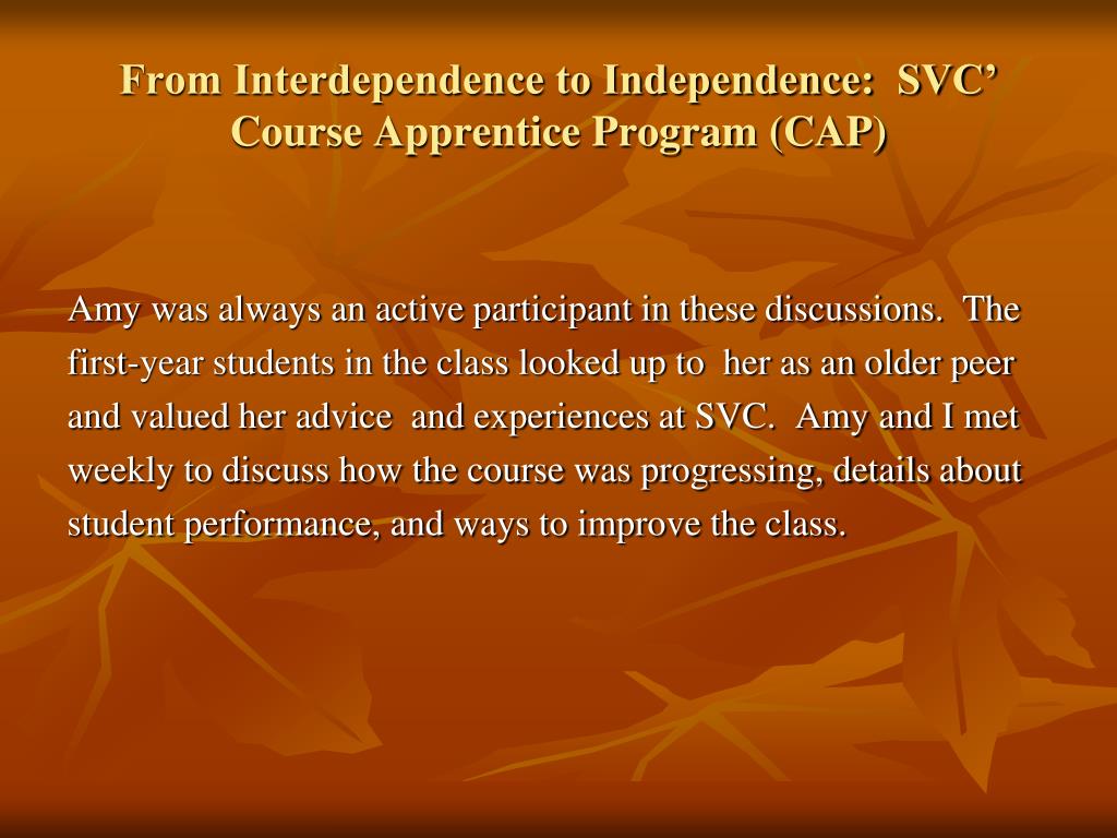 From Interdependence to Independence: SVC’s Course Apprentice Program (CAP) Because the CAP students were clearly more mature than the rest of the students, they were comfortable as mentors and as co-learners with the newer students. The newer students respected Ben and Brett, learning from them because of the strong relationship they established and because of their acquired academic skills as a result of their years at SVC. Because Brett and Ben did so well, I sincerely hope that the program will be extended and expanded in the future so that CAP students permeate the entire curriculum.