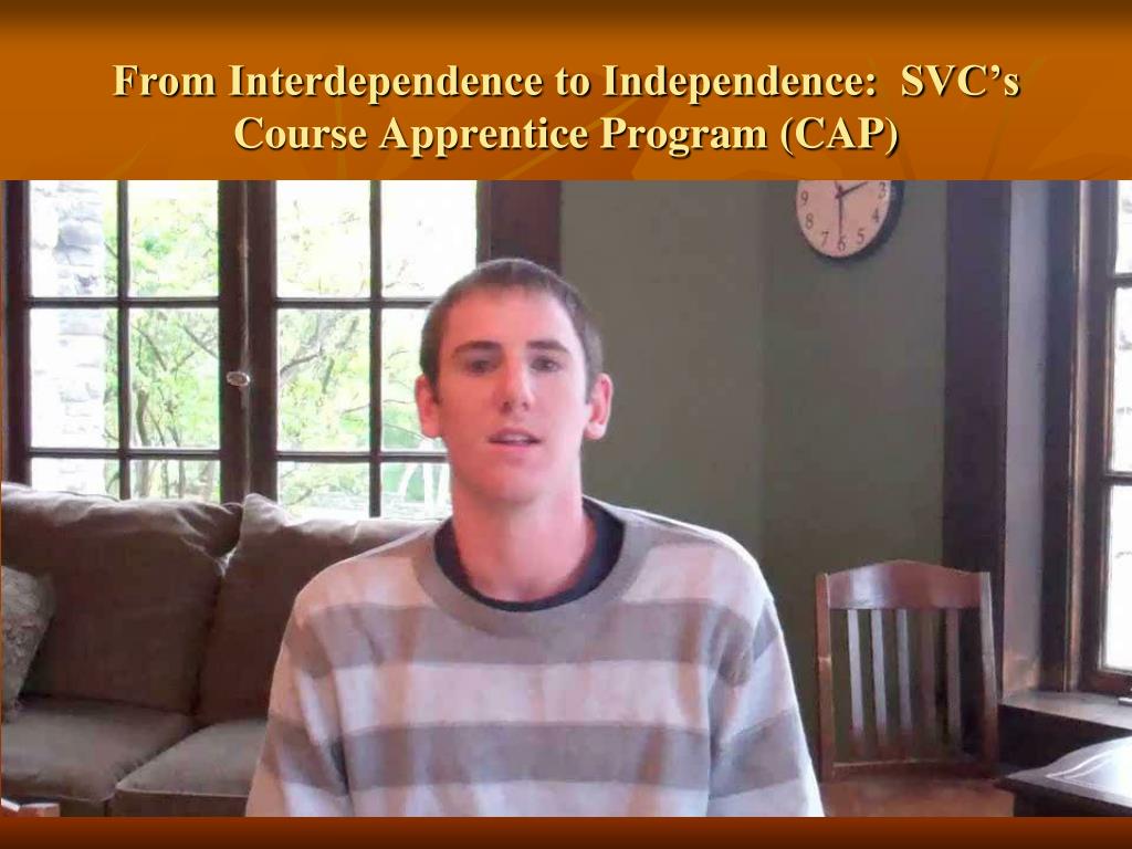 From Interdependence to Independence: SVC’s Course Apprentice Program (CAP) CAP is both a 2-credit, letter-graded academic course and an academic program: it is supported and coordinated through the Office of the SVC Provost. CAP students are nominated and selected by a faculty sponsor; they work closely with the faculty member whose course they are “apprenticing” within, those students who are matriculating in this course, and the professor of the CAP course, which provides their preparation.