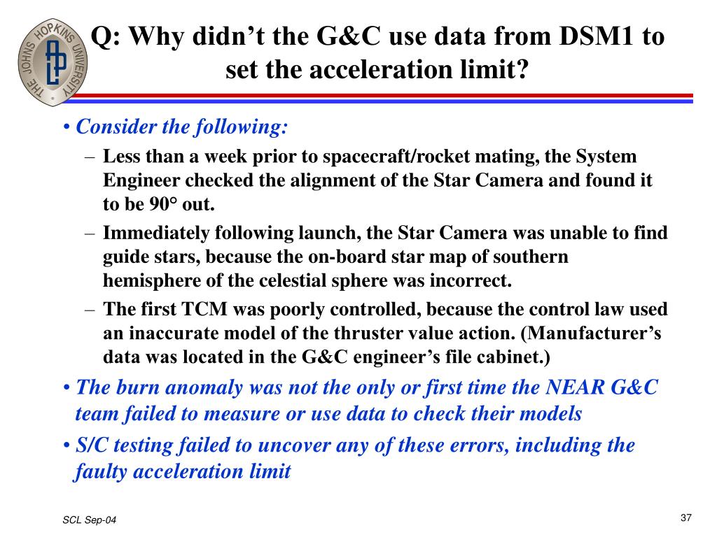 Q: Why didn’t the G&C use data from DSM1 to set the acceleration limit? • Consider the following: • Less than a week prior to spacecraft/rocket mating, the System Engineer checked the alignment of the Star Camera and found it to be 90° out. • Immediately following launch, the Star Camera was unable to find guide stars, because the on-board star map of southern hemisphere of the celestial sphere was incorrect. • The first TCM was poorly controlled, because the control law used an inaccurate model of the thruster value action. (Manufacturer’s data was located in the G&C engineer’s file cabinet.) • The burn anomaly was not the only or first time the NEAR G&C team failed to measure or use data to check their models • S/C testing failed to uncover any of these errors, including the faulty acceleration limit