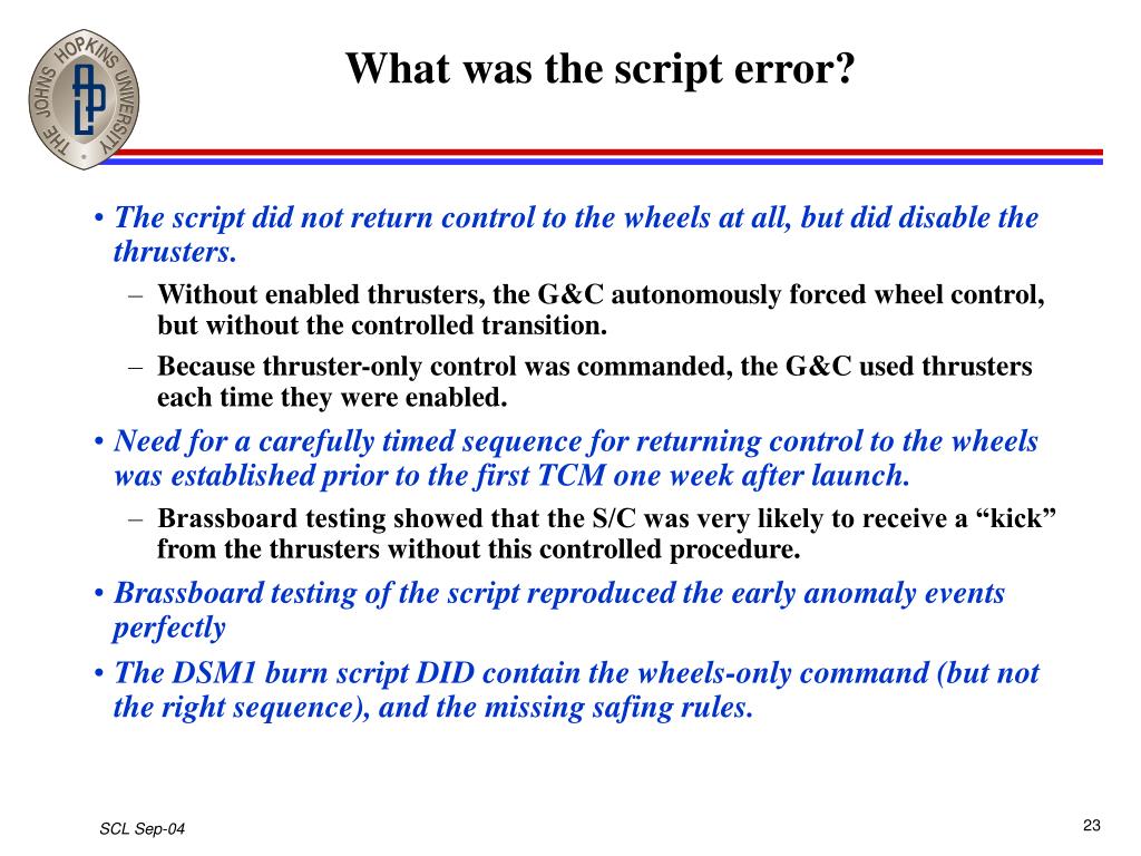 What was the script error? • The script did not return control to the wheels at all, but did disable the thrusters. • Without enabled thrusters, the G&C autonomously forced wheel control, but without the controlled transition. • Because thruster-only control was commanded, the G&C used thrusters each time they were enabled. • Need for a carefully timed sequence for returning control to the wheels was established prior to the first TCM one week after launch. • Brassboard testing showed that the S/C was very likely to receive a “kick” from the thrusters without this controlled procedure. • Brassboard testing of the script reproduced the early anomaly events perfectly • The DSM1 burn script DID contain the wheels-only command (but not the right sequence), and the missing safing rules.