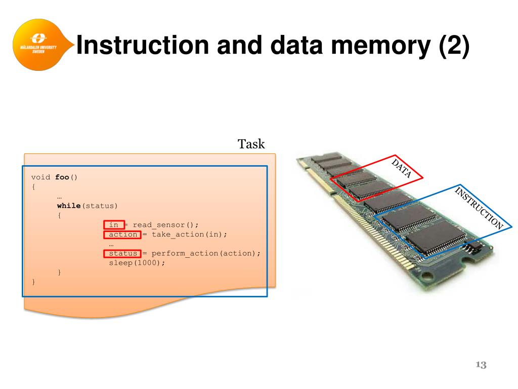 Instruction and data memory (2) Task DATA • voidfoo() • { • … • while(status) • { • in = read_sensor(); • action = take_action(in); • … • status = perform_action(action); • sleep(1000); • } • } INSTRUCTION