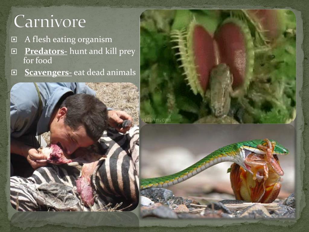 Carnivore • A flesh eating organism • Predators- hunt and kill prey for food • Scavengers- eat dead animals