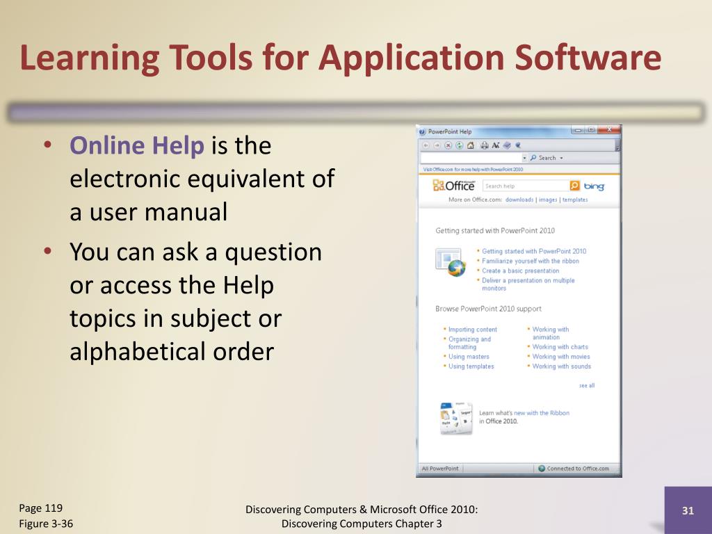 Learning Tools for Application Software • Online Helpis the electronic equivalent of a user manual • You can ask a question or access the Help topics in subject or alphabetical order Page 119 Figure 3-36 Discovering Computers & Microsoft Office 2010: Discovering Computers Chapter 3