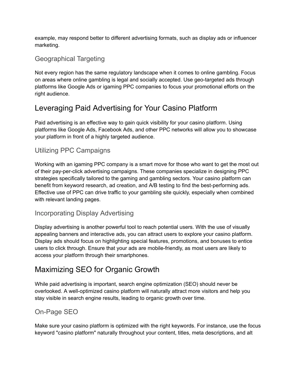 example, may respond better to different advertising formats, such as display ads or influencer marketing. Geographical Targeting Not every region has the same regulatory landscape when it comes to online gambling. Focus on areas where online gambling is legal and socially accepted. Use geo-targeted ads through platforms like Google Ads or igaming PPC companies to focus your promotional efforts on the right audience. Leveraging Paid Advertising for Your Casino Platform Paid advertising is an effective way to gain quick visibility for your casino platform. Using platforms like Google Ads, Facebook Ads, and other PPC networks will allow you to showcase your platform in front of a highly targeted audience. Utilizing PPC Campaigns Working with an igaming PPC company is a smart move for those who want to get the most out of their pay-per-click advertising campaigns. These companies specialize in designing PPC strategies specifically tailored to the gaming and gambling sectors. Your casino platform can benefit from keyword research, ad creation, and A/B testing to find the best-performing ads. Effective use of PPC can drive traffic to your gambling site quickly, especially when combined with relevant landing pages. Incorporating Display Advertising Display advertising is another powerful tool to reach potential users. With the use of visually appealing banners and interactive ads, you can attract users to explore your casino platform. Display ads should focus on highlighting special features, promotions, and bonuses to entice users to click through. Ensure that your ads are mobile-friendly, as most users are likely to access your platform through their smartphones. Maximizing SEO for Organic Growth While paid advertising is important, search engine optimization (SEO) should never be overlooked. A well-optimized casino platform will naturally attract more visitors and help you stay visible in search engine results, leading to organic growth over time. On-Page SEO Make sure your casino platform is optimized with the right keywords. For instance, use the focus keyword "casino platform" naturally throughout your content, titles, meta descriptions, and alt