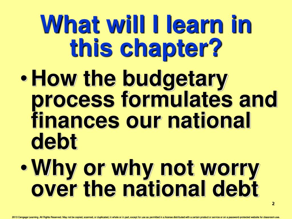 What will I learn in this chapter? How the budgetary process formulates and finances our national debt Why or why not worry over the national debt 2