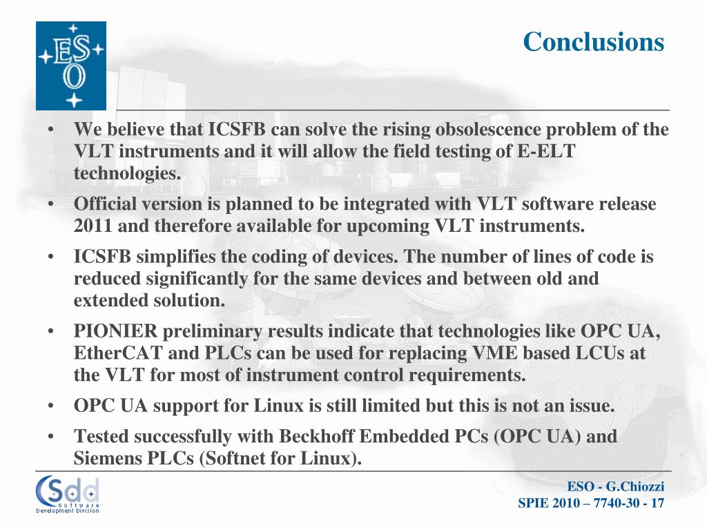 Conclusions • We believe that ICSFB can solve the rising obsolescence problem of the VLT instruments and it will allow the field testing of E-ELT technologies. • Official version is planned to be integrated with VLT software release 2011 and therefore available for upcoming VLT instruments. • ICSFB simplifies the coding of devices. The number of lines of code is reduced significantly for the same devices and between old and extended solution. • PIONIER preliminary results indicate that technologies like OPC UA, EtherCAT and PLCs can be used for replacing VME based LCUs at the VLT for most of instrument control requirements. • OPC UA support for Linux is still limited but this is not an issue. • Tested successfully with Beckhoff Embedded PCs (OPC UA) and Siemens PLCs (Softnet for Linux).
