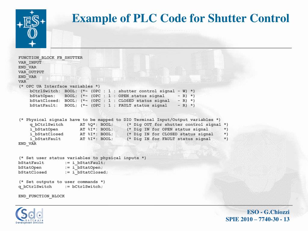 Example of PLC Code for Shutter Control FUNCTION_BLOCK FB_SHUTTER VAR_INPUT END_VAR VAR_OUTPUT END_VAR VAR (* OPC UA Interface variables *) bCtrlSwitch: BOOL; (*~ (OPC : 1 : shutter control signal - W) *) bStatOpen: BOOL; (*~ (OPC : 1 : OPEN status signal - R) *) bStatClosed: BOOL; (*~ (OPC : 1 : CLOSED status signal - R) *) bStatFault: BOOL; (*~ (OPC : 1 : FAULT status signal - R) *) (* Physical signals have to be mapped to DIO Terminal Input/Output variables *) q_bCtrlSwitch AT %Q*: BOOL; (* Dig OUT for shutter control signal *) i_bStatOpen AT %I*: BOOL; (* Dig IN for OPEN status signal *) i_bStatClosed AT %I*: BOOL; (* Dig IN for CLOSED status signal *) i_bStatFault AT %I*: BOOL; (* Dig IN for FAULT status signal *) END_VAR (* Set user status variables to physical inputs *) bStatFault := i_bStatFault; bStatOpen := i_bStatOpen; bStatClosed := i_bStatClosed; (* Set outputs to user commands *) q_bCtrlSwitch := bCtrlSwitch; END_FUNCTION_BLOCK