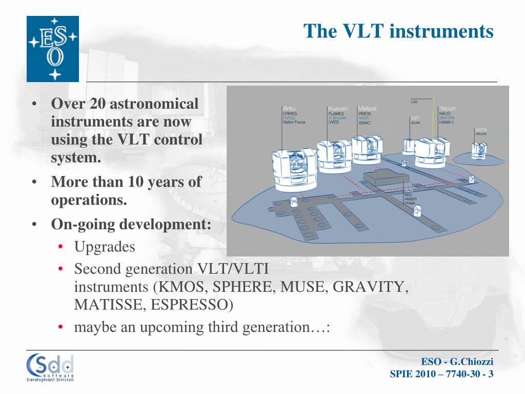 The VLT instruments • Over 20 astronomical instruments are nowusing the VLT control system. • More than 10 years of operations. • On-going development: • Upgrades • Second generation VLT/VLTI instruments (KMOS, SPHERE, MUSE, GRAVITY, MATISSE, ESPRESSO) • maybe an upcoming third generation…: