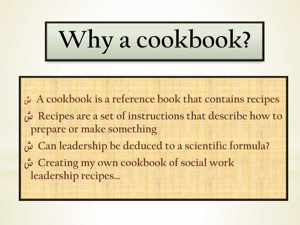 A cookbook is a reference book that contains recipes • Recipes are a set of instructions that describe how to prepare or make something • Can leadership be deduced to a scientific formula? • Creating my own cookbook of social work leadership recipes… Why a cookbook?